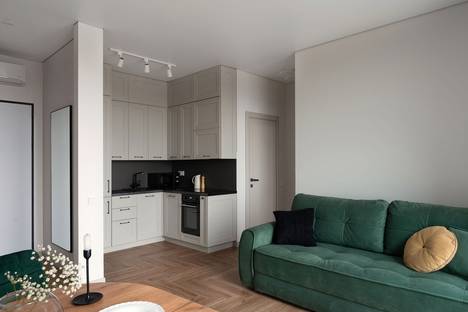 Эта квартира – воплощение уюта и современного дизайна: просторная, светлая и наполненная натуральным светом благодаря панорамным окнам. Интерьер, оформленный в благородных кремовых и глубоких тёмно-зелёных тонах, дарит ощущение спокойствия и гармонии, а продуманные детали создают атмосферу эксклюзивного комфорта.