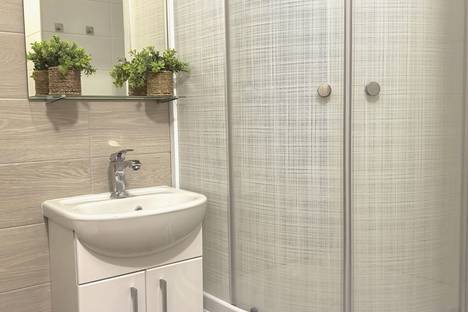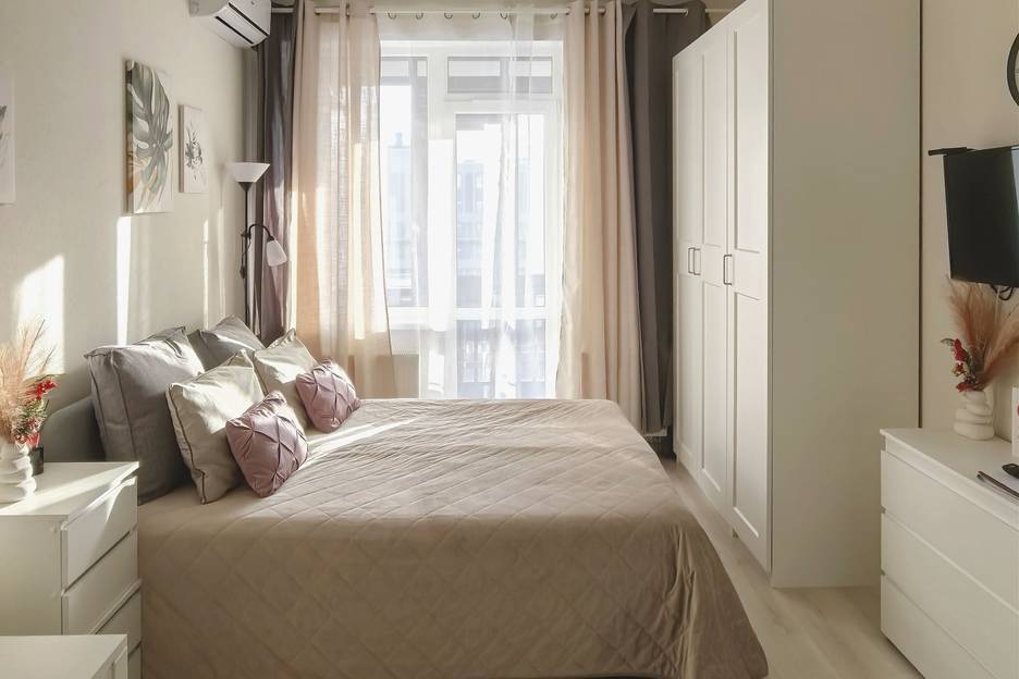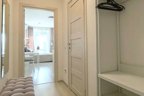 Студия с кухней в современном дизайнерском стиле, выполненном в пастельных тонах с теплыми оттенками. Каждая деталь здесь продумана до мелочей для комфорта гостей.