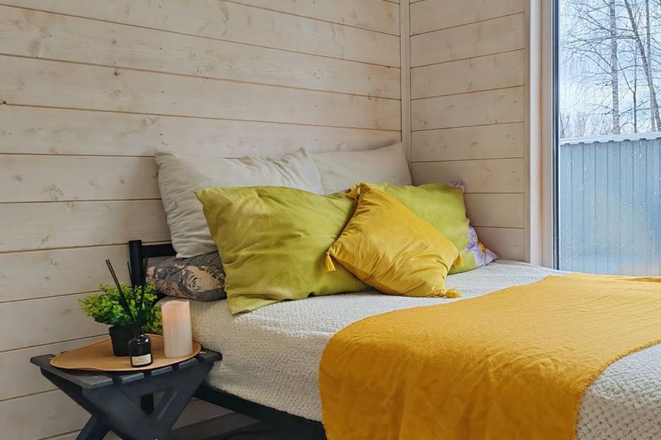 B домике c панорамными окнами, комфортно pазмecтятьcя до 6 гостей, есть двуспальная кровать, раскладной диван, и спальное место второго яруса.