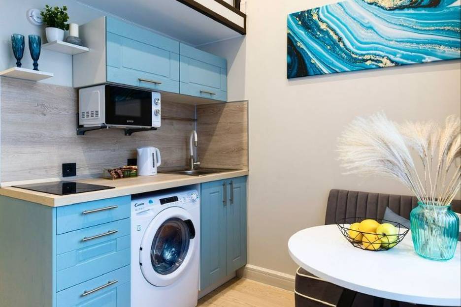 - Полностью оборудованная кухня: холодильник, плита, микроволновка, чайник, посуда, столовые приборы