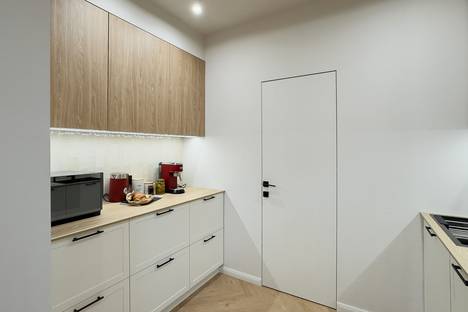 Просторное и очень светлое пространство. Кухня полностью укомплектована: есть рожковая кофеварка для ароматного эспрессо по утрам и всё необходимое для приготовления ужина. В зоне гостиной — огромный уютный (и очень фотогеничный!) диван и Smart TV.