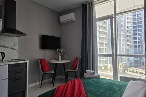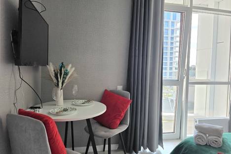 Уютная студия от «Славно» с балконом находится в ЖК бизнес-класса. В квартире новый евроремонт, все детали продуманы до мелочей. Интерьер здесь выполнен в серых тонах, есть балкон с уличной мебелью и кухонный уголок. Площадь студии – 19 кв.м., в ней есть всё необходимое для комфортного проживания двоих гостей.