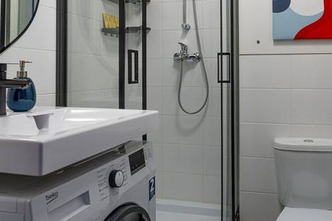 душ, стиральная машина, полотенца, шампунь, гель для душа.