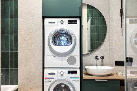 Особенность апартаментов — два санузла. В главной ванной комнате есть душевая, ванна, стиральная и сушильная машины. Для хранения вещей предусмотрена просторная гардеробная, а кондиционер в гостиной поддерживает комфортную температуру.