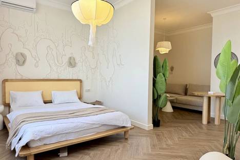 Современная и светлая студия с дизайнерским ремонтом и прямым видом на Каспийское море.