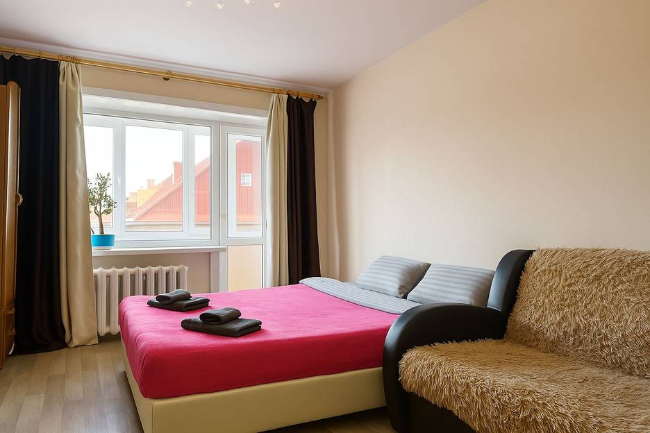 МИР УЮТА 65 предлагает солнечную однокомнатную квартиру посуточно рядом с Площадью Победы и горнолыжным курортом "Горный воздух"!