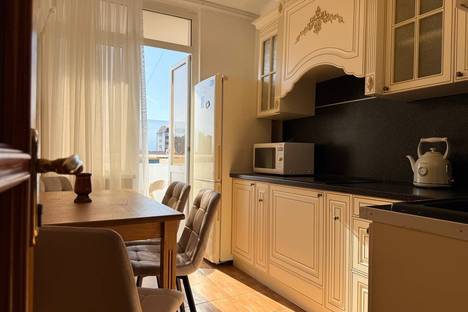 Кухня: оборудована всем необходимым — холодильник, микроволновка, посуда, чайник, обеденная зона, выход на балкон с видом на город.