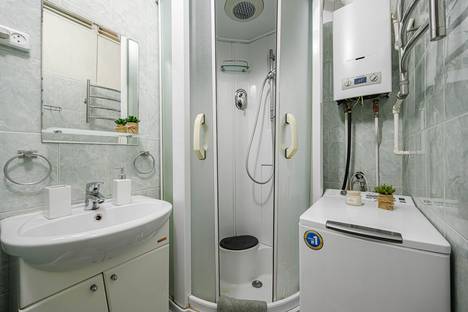 Ванная: душ, стиральная машина, водонагреватель, фен, полотенца.