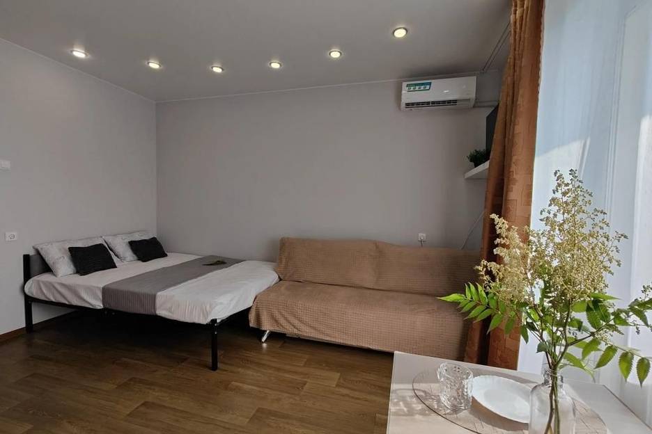 Инфраструктура района 👍.Квартира уютная. Не солнечная сторона👍 Все необходимое есть. (но только на 3-х человек) . Муж+Жена+ребёнок. Но можно и без ребёнка))). Телевизор бы переместить на стену, тогда вообще 🤌. Спасибо!