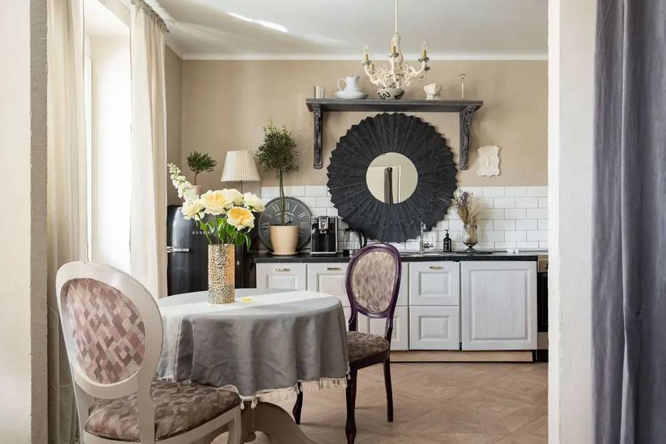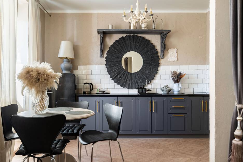 Квартира с просторной кухней-гостиной и отдельной спальней.