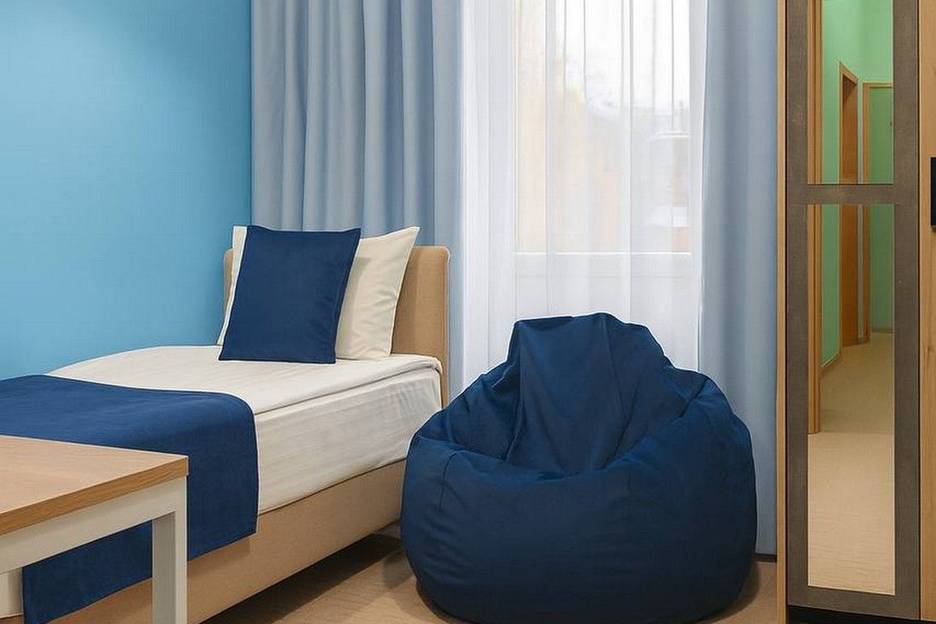 Отдельный номер с ремонтом площадью 7,4 м2 до 10,5 м2. В номере: вешалка для верхней одежды, шкаф с вешалками для одежды, односпальная кровать 90*200 с ортопедическим матрасом, стол, мягкий стул, телевизор от 32 дюймов, холодильник, чайник, чайный набор, питьевая вода 0,5 л., салфетки. Санузел с душем, фен, туалетные принадлежности (шампунь и гель для душа, зубной набор, туалетная бумага, освежитель воздуха). Махровый халат и тапочки