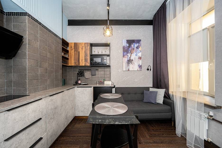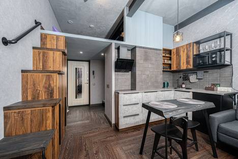 Двухуровневая квартира премиум класса с дизайнерским ремонтом, оборудованной кухней и спальной зоной на втором этаже. Расположена в Адмиралтейском районе Санкт-Петербурга.
