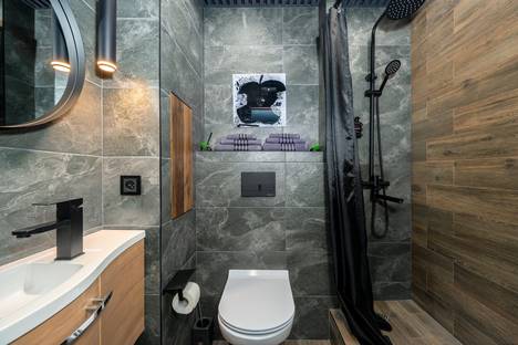 - В ванной комнате: душ,стиральная машина, фен, утюг и базовый набор гигиенических средств, полотенца для ног, рук и тела на каждого гостя.