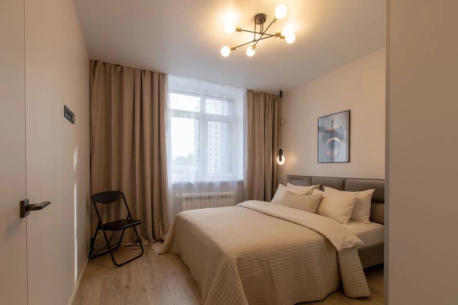 Современный интерьер, комфортабельная двуспальная кровать и уютная мебель