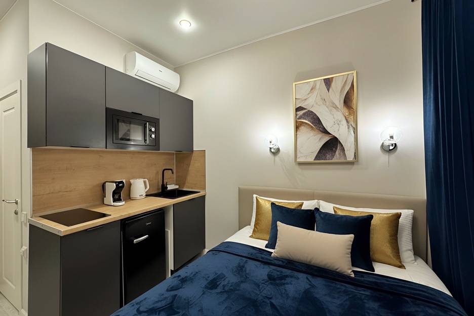 ✅ Плита, холодильник, микроволновая печь, чайник, набор посуды, кофемашина;