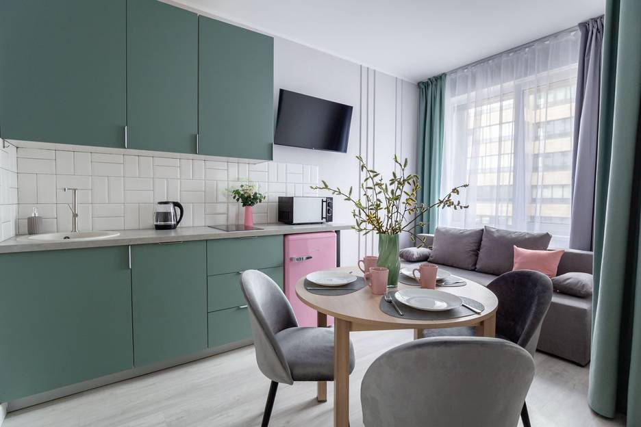 - Стильный холодильник,индукционная плита, стиральная машина, микроволновая печь, электрочайник, фен, утюг, гладильная доска.