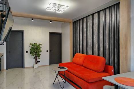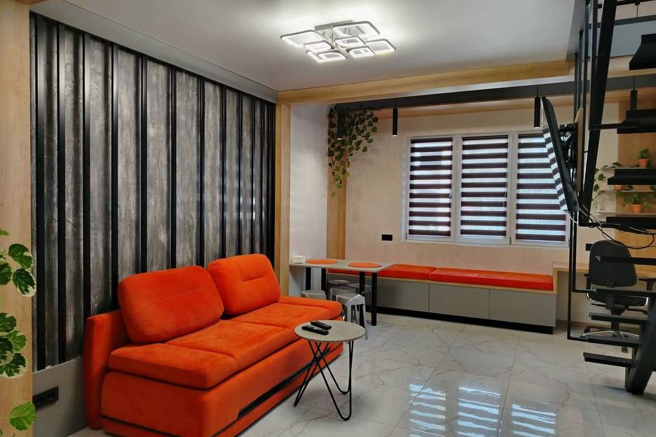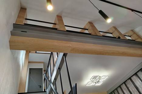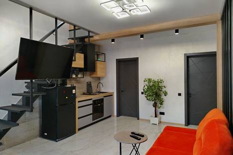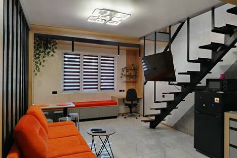 Двухуровневые апартаменты с дизайнерским ремонтом в частном секторе недалеко от центра. На первом этаже гостевая, с диваном, кухня и санузел с душевой. На втором этаже спальная зона с двухспальной кроватью, которая может трансформироваться на две односпальные и, кроме этого, есть ещё две выкатные односпальные кровати, спрятанные под подиумом. В апартаментах удобно могут разместиться гости в количестве до 6-ти человек.