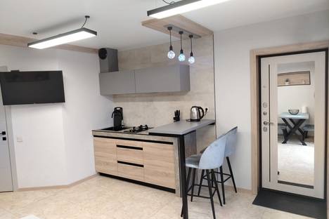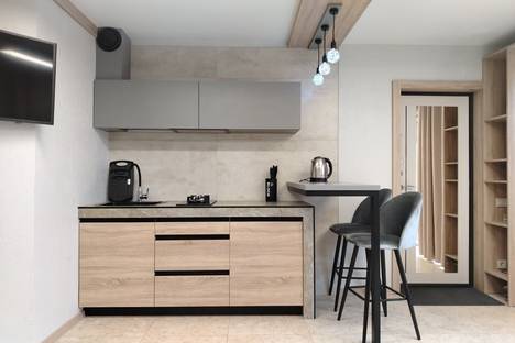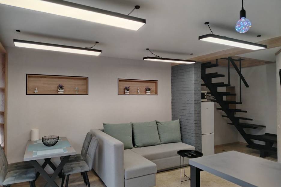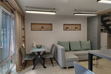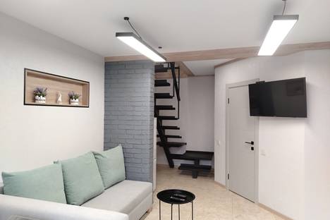 Двухуровневые апартаменты с дизайнерским ремонтом в частном секторе недалеко от центра. В наличии отдельный вход и дворик с садовой мебелью и мангалом. На первом этаже гостевая, с угловым диваном, кухня и санузел с душевой. На втором этаже спальная зона с двухспальной кроватью, которая может трансформироваться на две односпальные и, кроме этого, есть ещё две выкатные односпальные кровати, спрятанные в стеллаже. В апартаментах удобно могут разместиться гости в количестве до 6-ти человек.