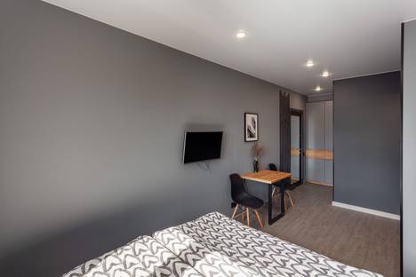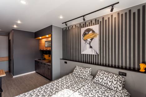 Уютная студия в самом центре Архангельск с современными интерьером и всем необходимым для комфортного отдыха. Есть зона кухни с необходимой посудой и техникой, телевизор с подключением к интернету и Wi fi.