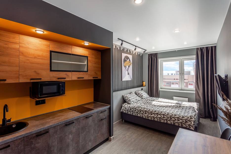 Уютная студия в самом центре Архангельск с современными интерьером и всем необходимым для комфортного отдыха. Есть зона кухни с необходимой посудой и техникой, телевизор с подключением к интернету и Wi fi.