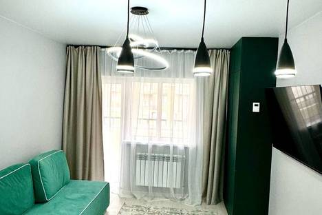 Современная однокомнатная квартира с яркой изумрудной кухней идеальное место для вашего комфортного отдыха или деловой поездки. Возможно размещение с детьми. Просторная кухня-гостиная с удобным раскладывающимся диваном.