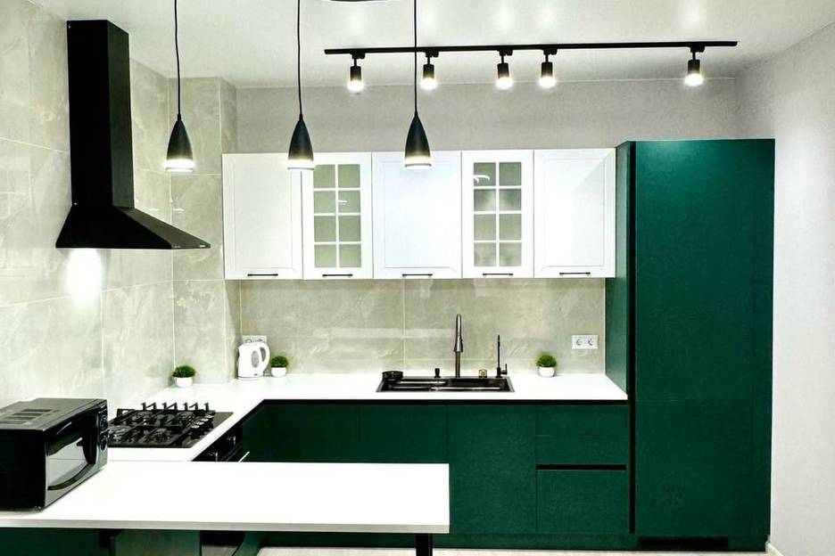 - Яркая и стильная изумрудная кухня с полностью оборудованной техникой