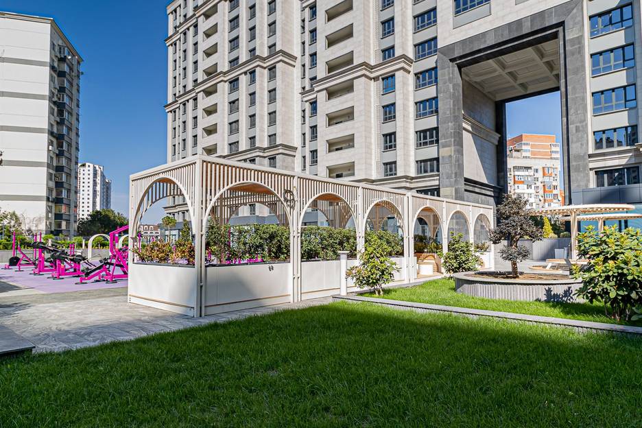 На территории комплекса спроектирован ландшафтный дизайн, выполнено озеленение территории, установлен фонтан и беседка, зона с тренажерами!