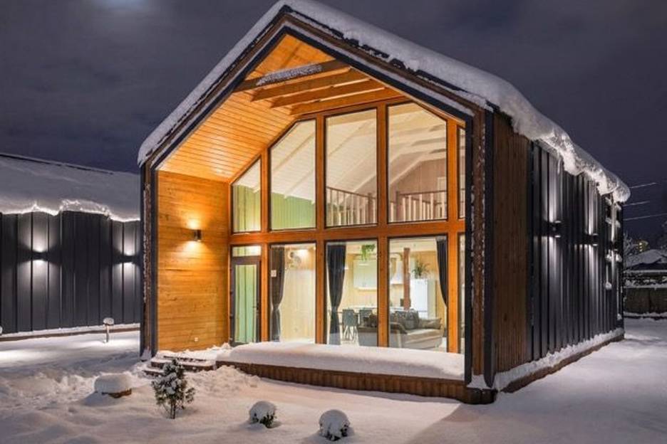 Современный двухэтажный дом из натурального дерева, с большими окнами и обилием естественного света: