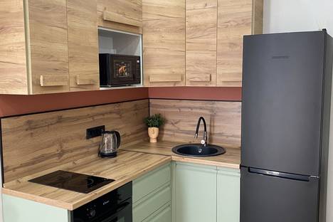 * Современная кухня: вся необходимая техника - холодильник, электрическая плита, микроволновая печь, чайник; посуда, в том числе для приготовления пищи, а также столовые приборы.