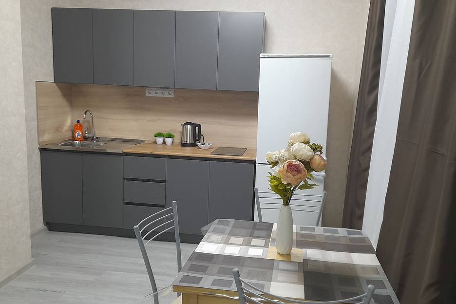 В кухонной зоне есть плита, необходимая посуда, чайник и холодильник, обеденный стол и 4 стула. Штопор, открывалка, овощечистка, ножницы, дуршлаг, терка, половник, венчик, разделочные доски, 3 кастрюли, ковш, 2 сковороды и прочее.