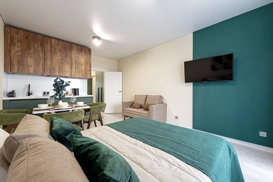 Новая стильная студия с большой кроватью и собственной кухней. Расположены в живописном месте на Набережной Макарова, в 10 минутах до Дворцовой площади.