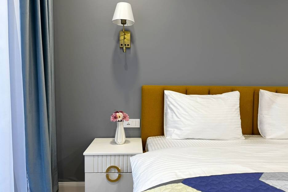 Квартира оформлена в современном и функциональном стиле, создавая приятную атмосферу для отдыха и работы. Просторные окна пропускают много естественного света, что подчеркивает уютное оформление интерьера. В спальне установлена комфортная двуспальная кровать с мягким изголовьем, дополняемая прикроватными светильниками для чтения.