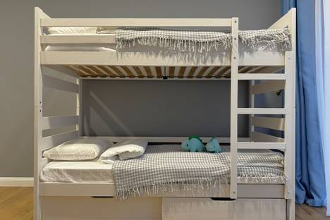 Для детей предусмотрены двухъярусные кровати, что делает квартиру идеальной для семейного размещения. Гостиная зона оснащена удобным диваном и обеденной группой, где можно проводить время всей семьей. Современная кухня удобна и способствует приготовлению пищи на своем оснащении.
