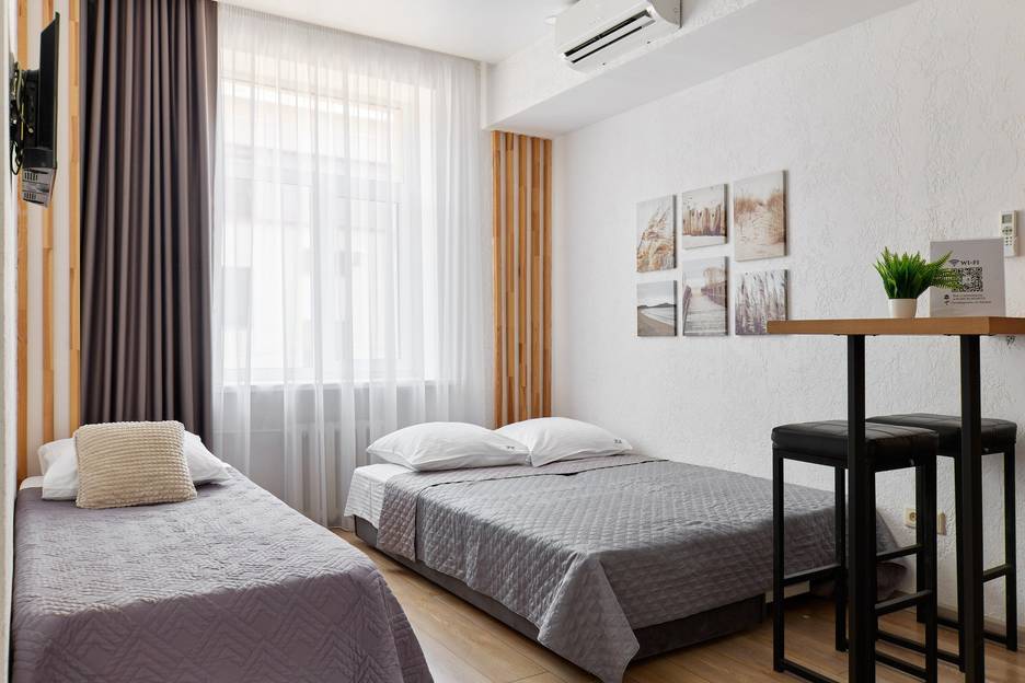 - Бесплатный Wi-Fi, кабельное ТВ, кондиционер, ночник и розетка в спальной зоне.