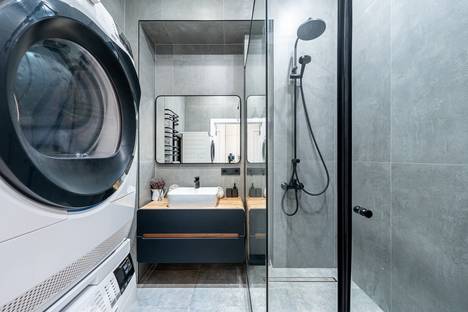 В ванной комнате: туалет, душ, стиральная машина, сушильная машина, фен, утюг, набор гигиенических средств, тапочки, полотенца для ног, рук и тела на каждого гостя.
