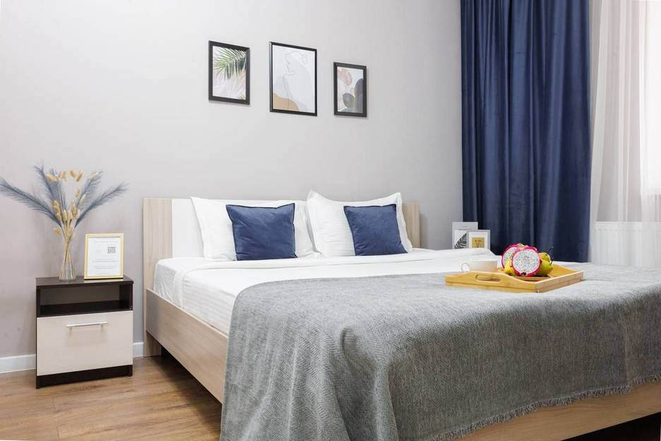В апартаментах имеются светлая спальня, просторная гостиная с раскладным диваном. Прекрасный вид на город и парк.
