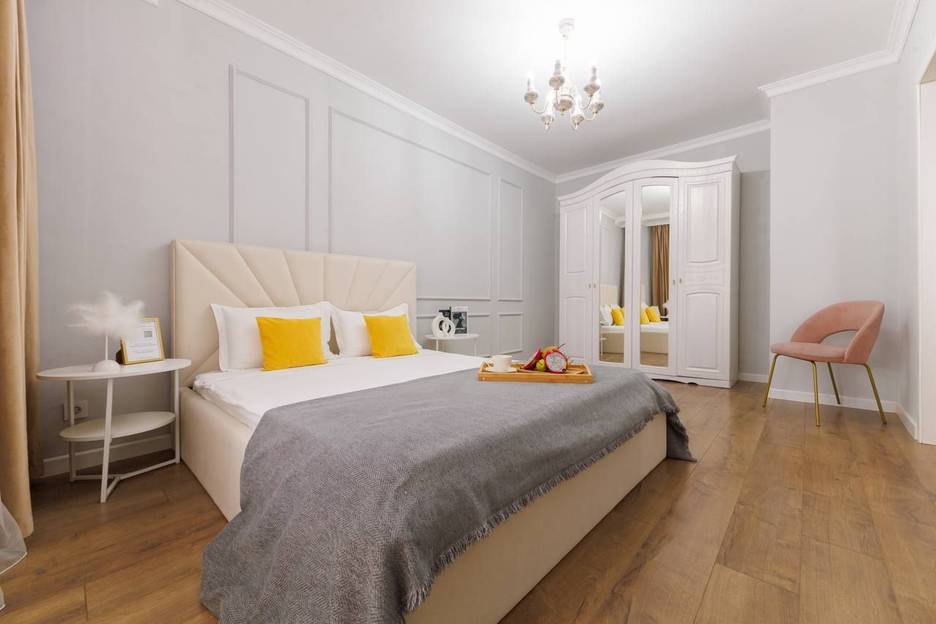 В апартаментах имеются светлая спальня с просторной кроватью и раскладным диваном.