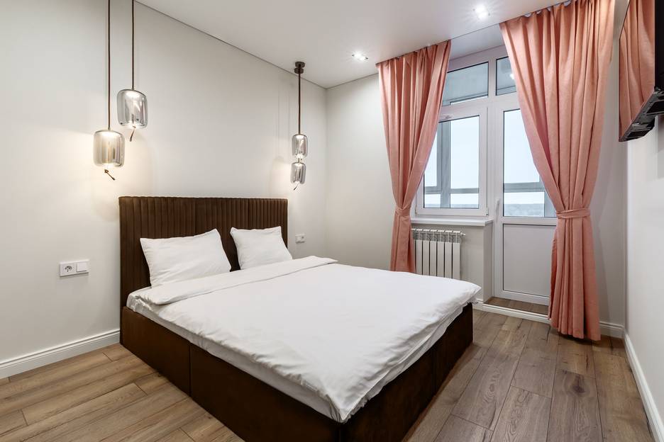 Спальня со стильными светильниками и удобной кроватью