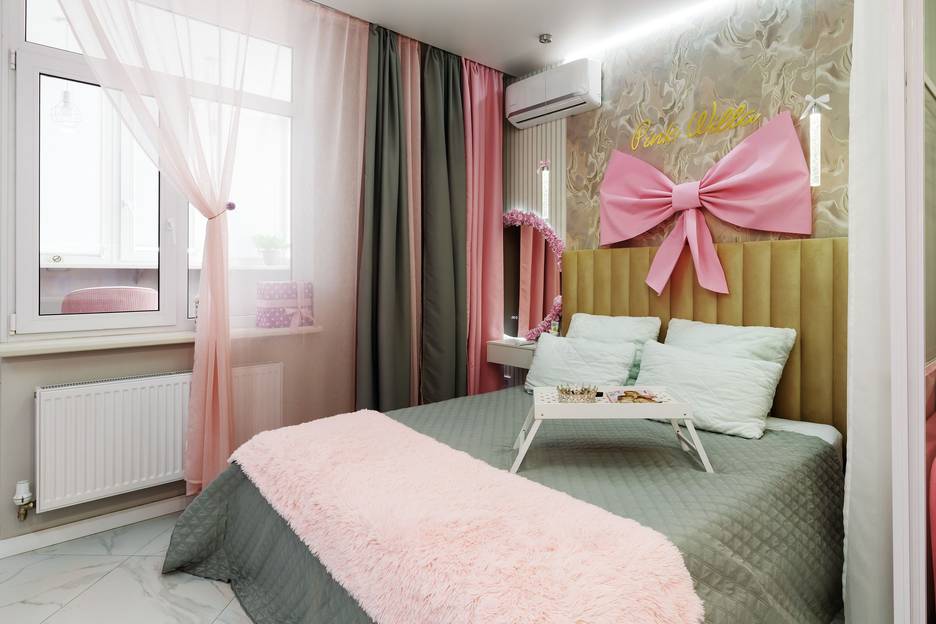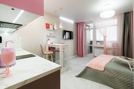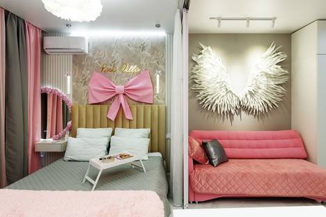 Квартира оформлена в нежных розовых тонах, создающих атмосферу уюта и спокойствия. Интерьер продуман до мелочей — здесь вы почувствуете себя как дома.