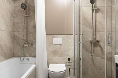 Санузел с новой сантехникой и ванной. Имеется фен, шампунь, гель для душа и мыло. Утюг, гладильная доска и раскладная сушка для белья.