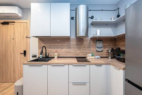 - В кухонной зоне: посудомоечная машина, микроволновая печь, холодильник, варочная панель, чайник, посуда и столовые приборы. Чай, кофе, сахар, соль, конфеты.