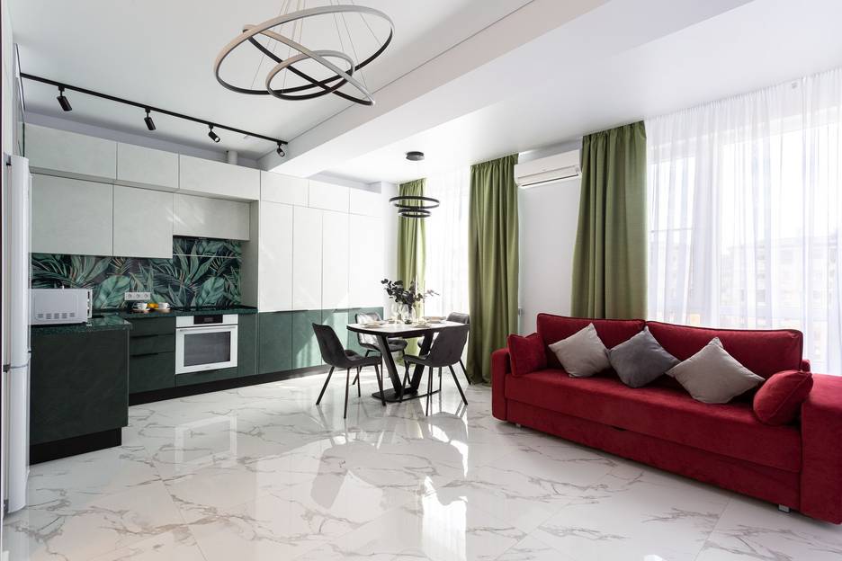Просторная планировка с удобной большой двуспальной кроватью в спальне и раскладным двуспальным диваном в кухне-гостиной.