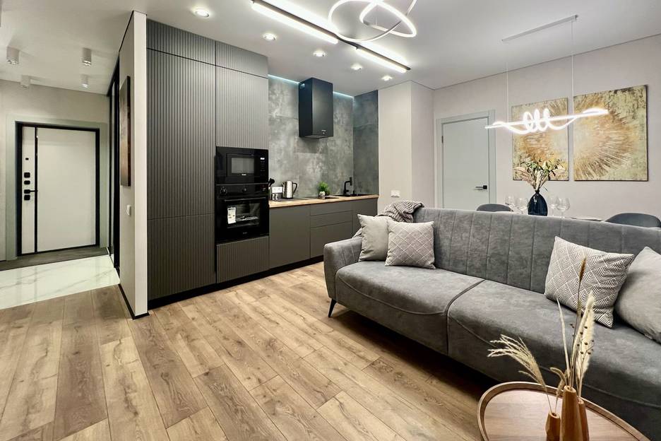Готовьте с удовольствием: Современная кухня-гостиная со всей техникой (индукционная плита, посуда).