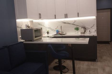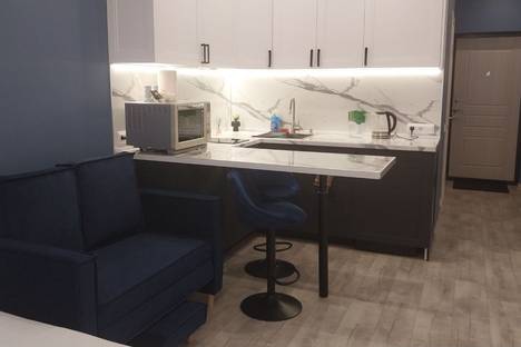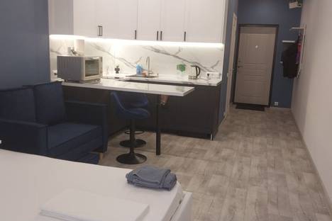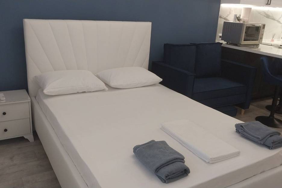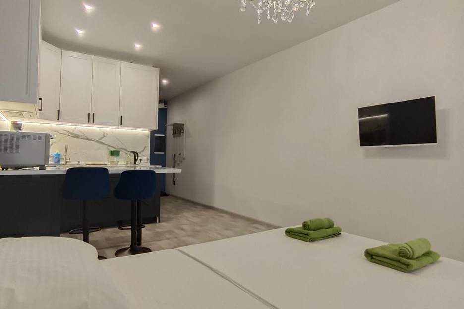 Просторная студия 28 кв. м с удобной кроватью. Кухня в светлых тонах оборудована микроволновой печью и плитой. В наличии вся необходимая посуда: кастрюли, сковорода, бокалы для шампанского и сока.