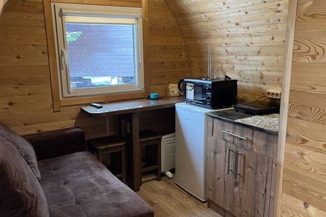 В однокомнатных домике 2 основных места (двуспальная кровать) и 1 дополнительное (раскладывающийся диван) для ребенка до 10 лет, кухонная зона и санузел с небольшой ванной.