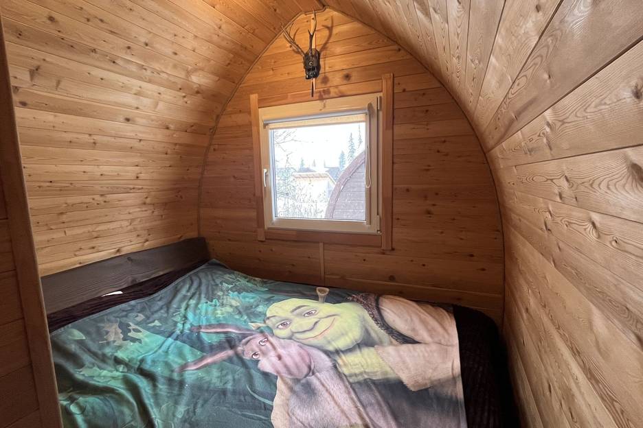В однокомнатных домике 2 основных места (двуспальная кровать) и 1 дополнительное (раскладывающийся диван) для ребенка до 10 лет, кухонная зона и санузел с небольшой ванной.