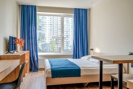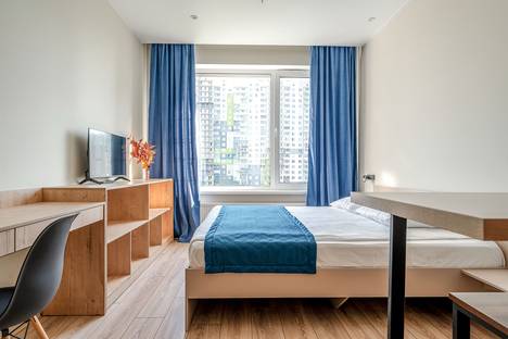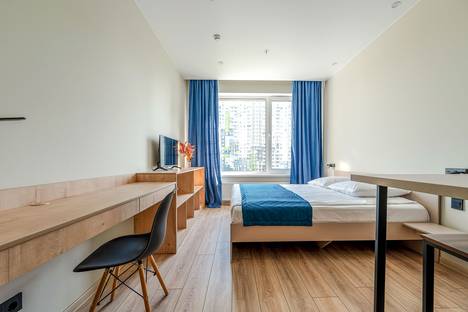 Апартамент с дизайнерским ремонтом в теплых тонах, большой кроватью, зоной кухни, санузлом с душевой кабиной и всем необходимым для комфортного проживания: