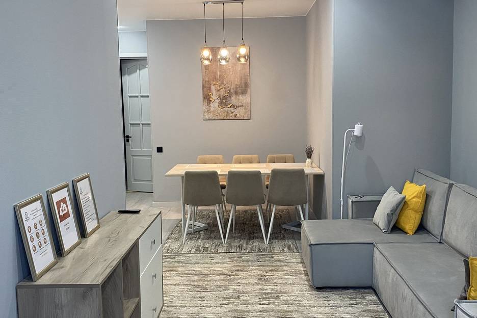 Апартаменты оснащены самым необходимым для комфортного пребывания : -2 двуспальные кровати с ортопедическими матрасами 160х200, 180х200 - диван-кровать со спальным местом 140Х200 - постельное белье и набор полотенец - кухня с кухонными принадлежностями -кофе машина капсульная для Nespresso капсул. -- микроволновка - тостер - водонагреватель - посудомоечная машина - кондиционер ( сплит система) - smart TV с диагональю 55 дюймов - варочная поверхность с вытяжкой - чистящие средства - средства гигиены - тапочки одноразовые ( по запросу) -стиральная машина