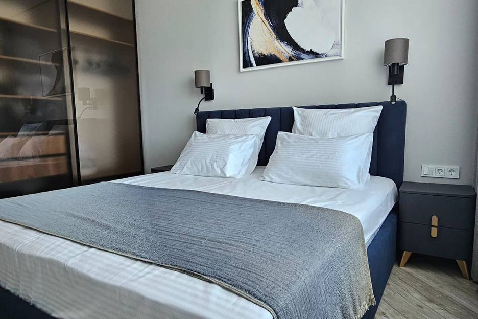 Спальня с большой кроватью и ортопедическим матрасом, гостинная с диваном и кухней.