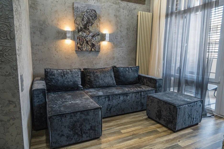 – обеденная зона со столом, смарт тв и диваном, который раскладывается в удобное спальное место рассчитанное на 2-х человек;